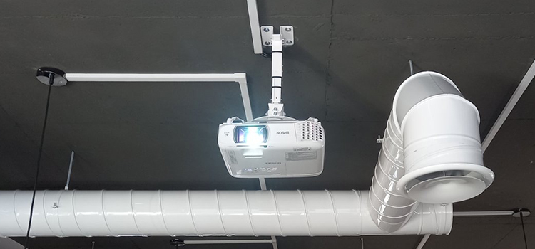 Почему выбрали это: Надежный стальной кронштейн с белым покрытием (в тон потолку). Регулировка наклона и поворота позволила нам идеально выровнять картинку на экране, несмотря на особенности потолочного перекрытия.