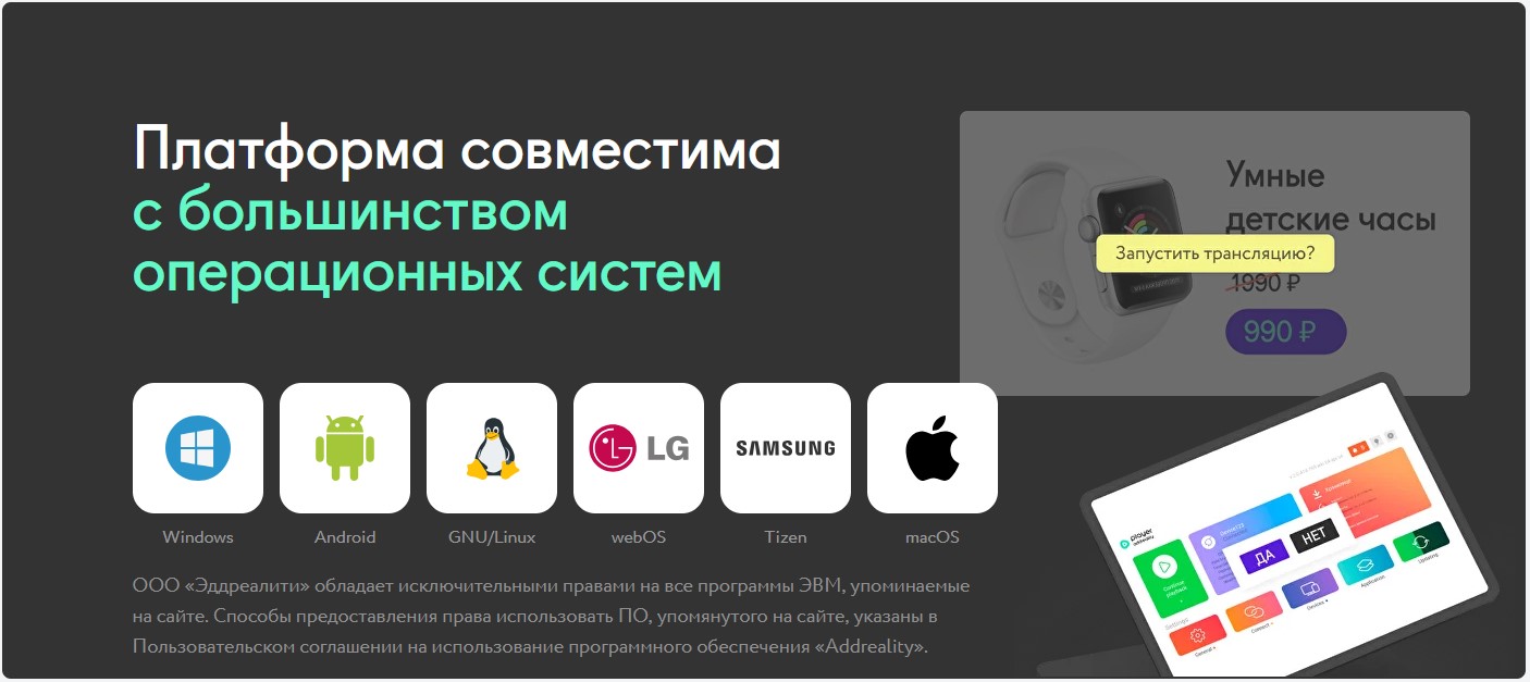 Платформа для управления контентом на мониторах и аудиоколонках с помощью программного обеспечения Addreality независимо от операционной системы и марки оборудования (Windows, MacOS, Android, iOS, webOS, LG и др.).