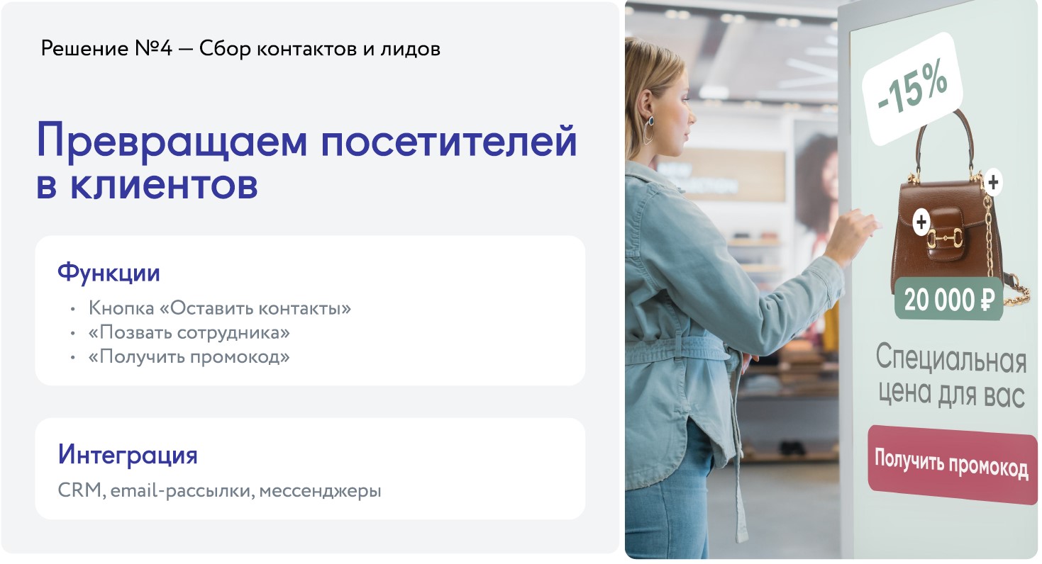 ПО помогает бизнесу из различных сфер (рознице, банкам, кафе, фитнес-клубам) превращать обычные экраны и проекторы в интеллектуальные инструменты коммуникации. Наша система позволяет удаленно управлять контентом на тысячах устройств, показывать адаптивную рекламу в зависимости от аудитории, времени и погоды, а также точно измерять эффективность с помощью встроенной видеоаналитики.
