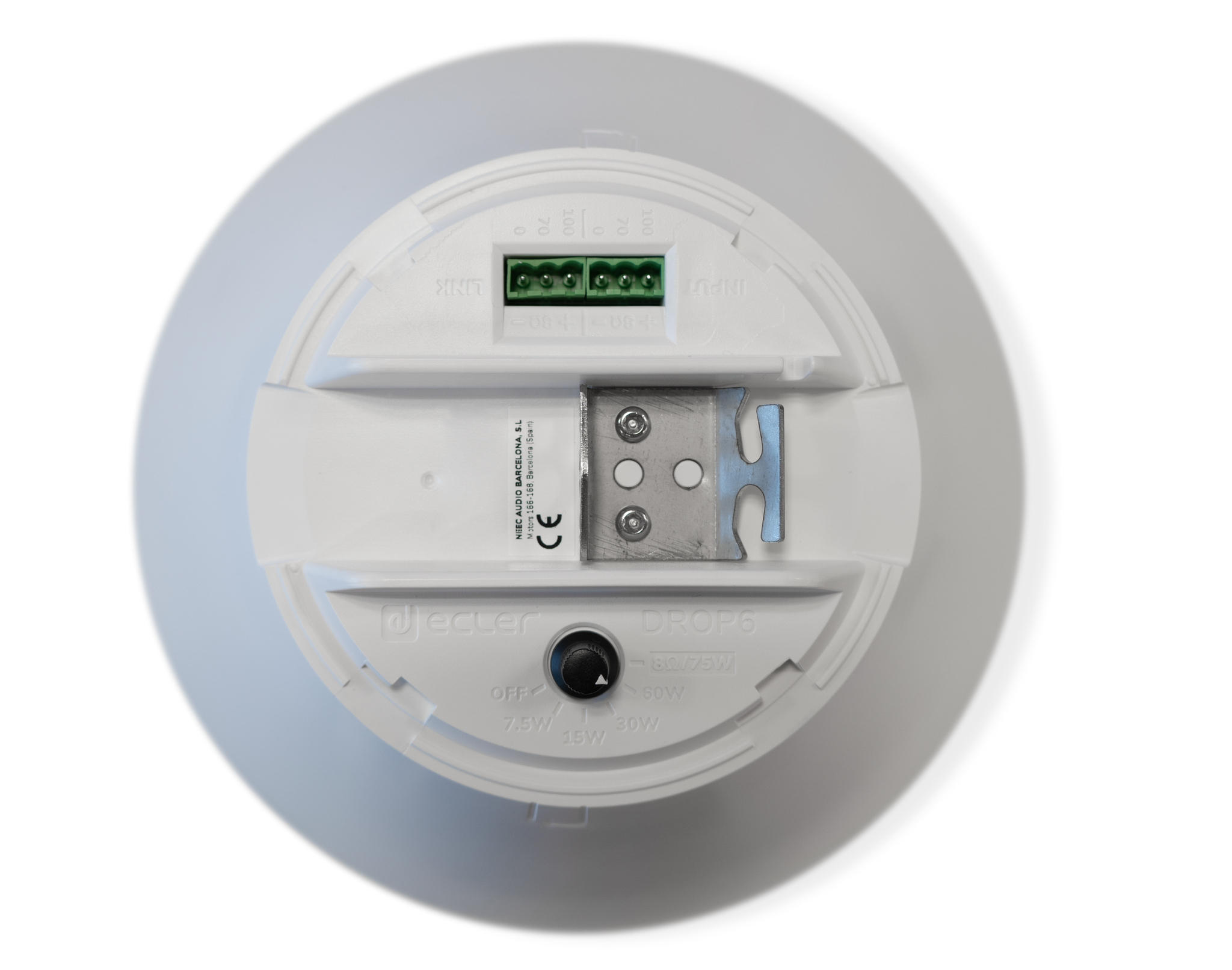 ECLER DROP6WH – 2-полосная подвесная акустическая система с прекрасными звуковыми характеристиками и уникальным дизайном. Она оснащена 6.5" НЧ вуфером и 1" ВЧ шелковым купольным твитером, которые обеспечивают 75 Вт мощности (RMS) при подключении 8 Ом. Пиковая мощность 300 Вт. Дополнительно предусмотрен высоковольтный трансформатор и поворотный селектор (под отвертку) выбора режима работы и уровня мощности: 70 В/100 В – 60 / 30 / 15 / 7,5 Вт. Выпускается в закрытом корпусе из ABS пластика с металлическим защитным грилем и предполагает подвесной монтаж с креплением к потолочным конструкциям при помощи комплектных монтажных элементов. Стандартная длина подвеса составляет 3 м и может корректироваться по месту в зависимости от конструктивных и акустических особенностей помещения. Рекомендуется применять усилитель мощностью 150 Вт.