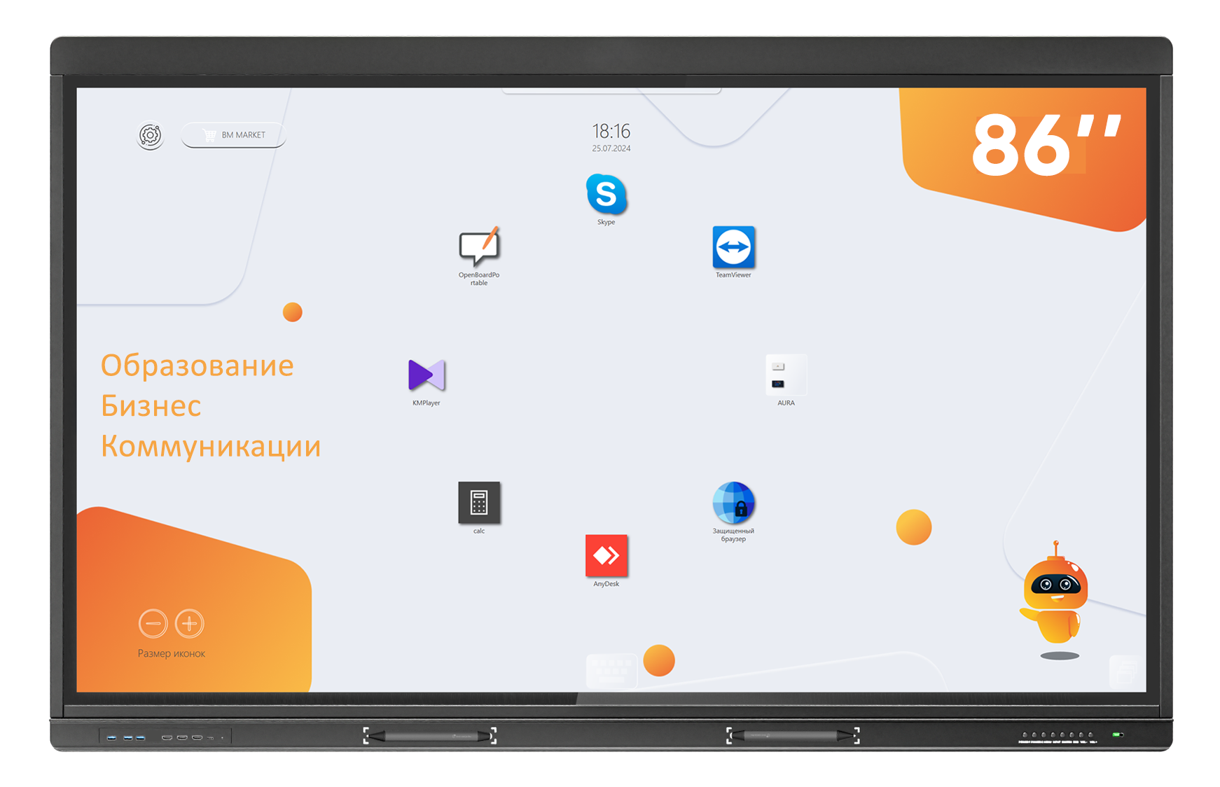 Интерактивная панель (мультиборд) серии Galactica с встроенным компьютером и Windows, исполнена в современном дизайне, не занимает много места, крепится на стену или на мобильную стойку на колесиках с фиксаторами. Это надежное и проверенное решение для образовательных учреждений школ, колледжей, ВУЗов, а также музеев и выставочных центров. Встроенная программная оболочка мультиборда BM Aura имеет систему удаленного мониторинга, пакет офисных приложений, пакет программ для проведения презентаций, программы для проведения уроков, режим "белая доска" и защищенный браузер.