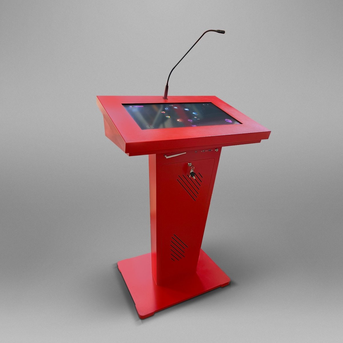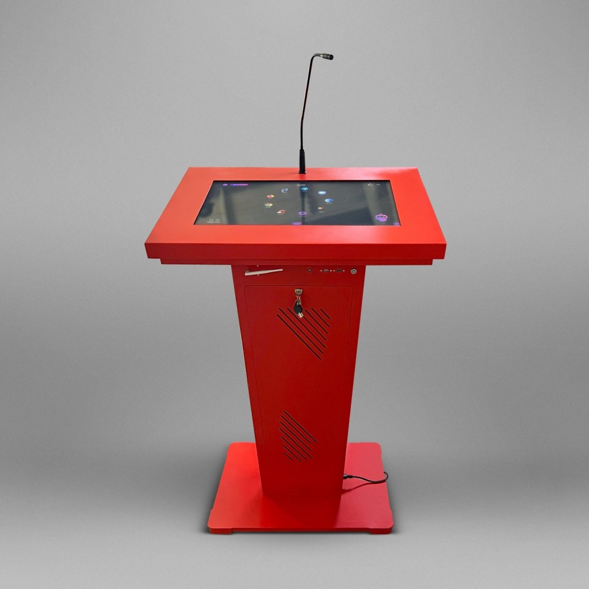 Эта интерактивная трибуна удивляет своим футуристическим и запоминающимся дизайном, а также имеет передовую техническую начинку. В ней предусмотрены все необходимые элементы для успешных выступлений: микрофоны, колонки, усилитель звука, разъемы для подключения оборудования. Также она оснащена большим сенсорным дисплеем и возможностью вывода информации на большой экран.