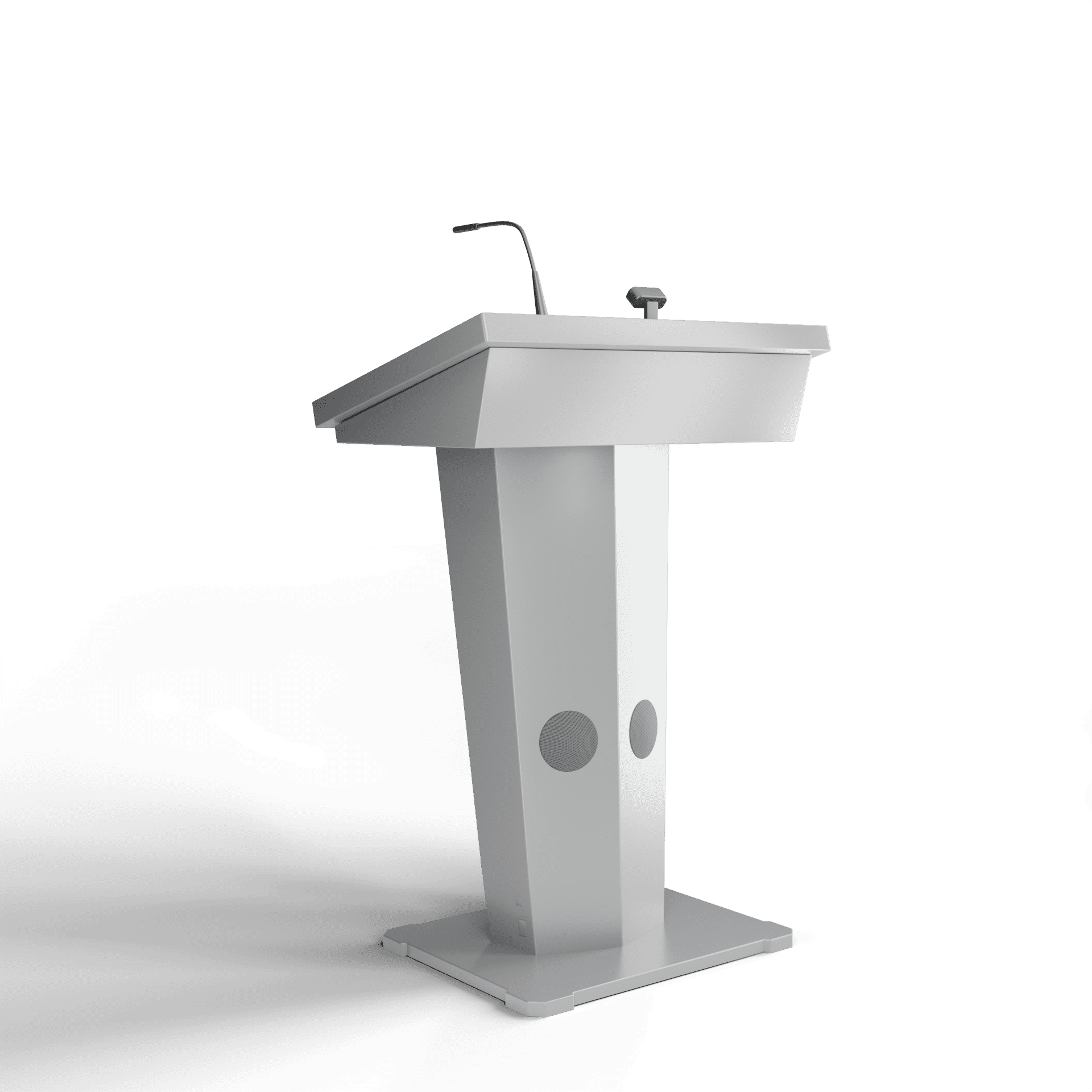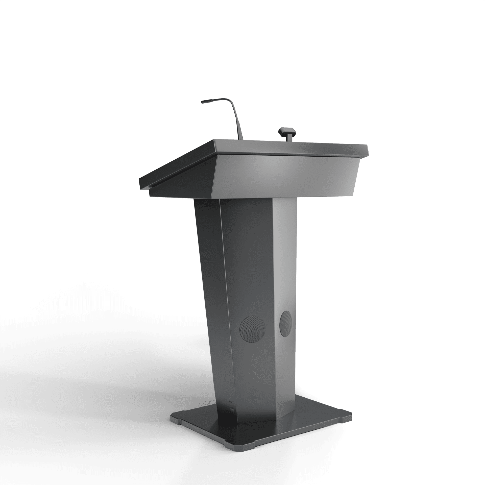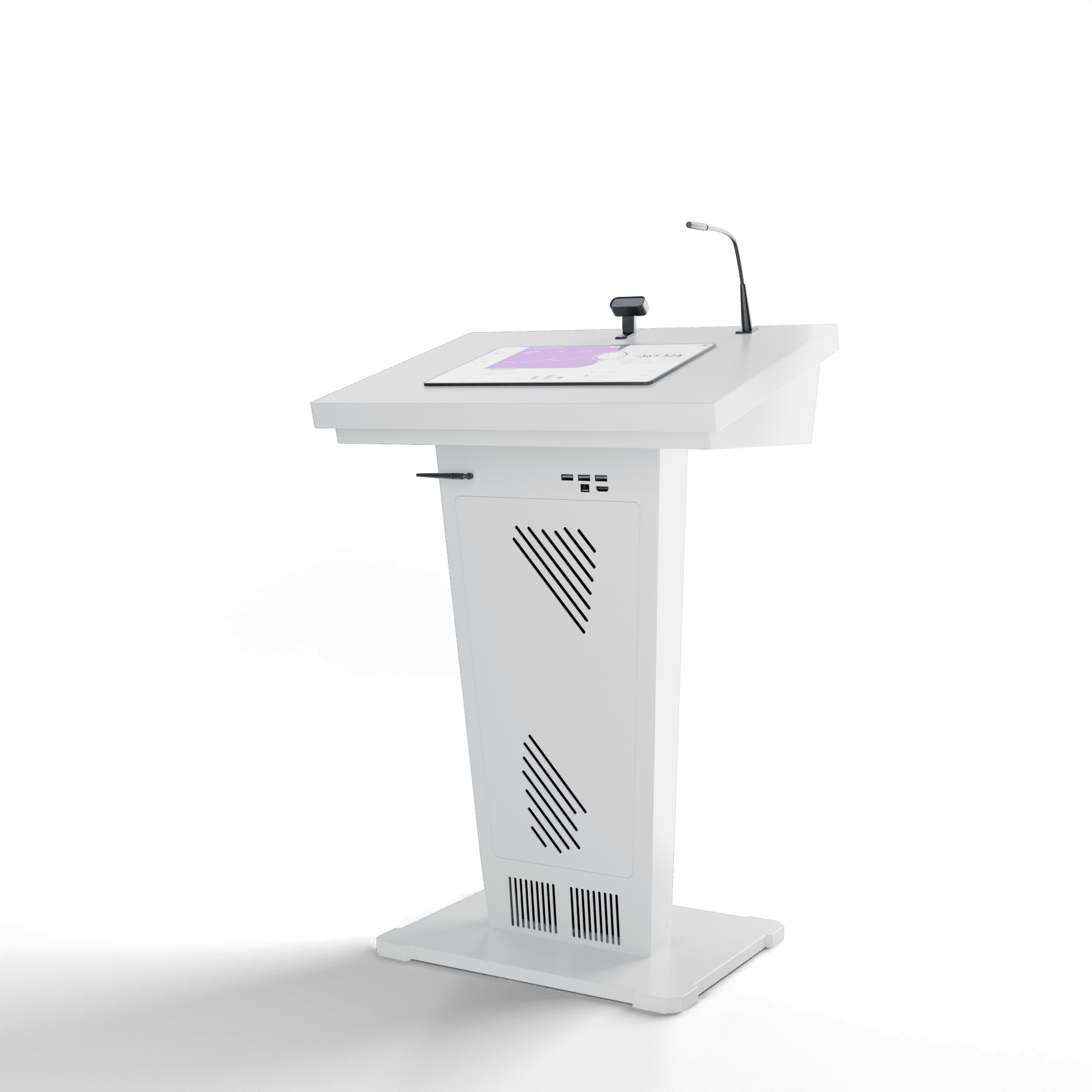 Эта интерактивная трибуна удивляет своим футуристическим и запоминающимся дизайном, а также имеет передовую техническую начинку. В ней предусмотрены все необходимые элементы для успешных выступлений: микрофоны, колонки, усилитель звука, разъемы для подключения оборудования. Также она оснащена большим сенсорным дисплеем и возможностью вывода информации на большой экран.