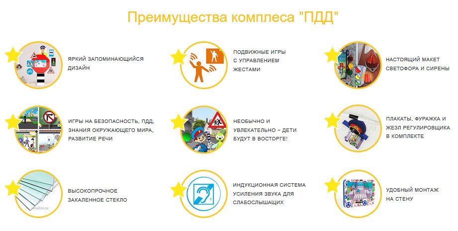 В комплекте с интерактивными комплексами идёт методическое пособие, набор плакатов, карточек с дорожными ситуациями, фуражка и жезл регулировщика. Интерактивные комплексы имеют встроенный макет светофора, при нажатии на кнопки которого будут загораться соответствующие цвета световых индикаторов – всё это позволит легко задействовать детей в процессе обучения, более наглядно и разнопланово рассмотреть различные дорожные ситуации, и усвоить важный для жизни материал.