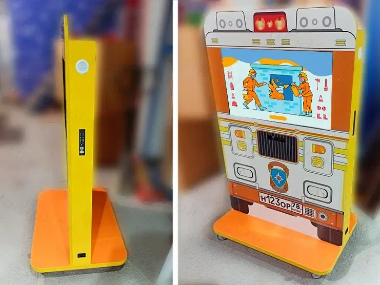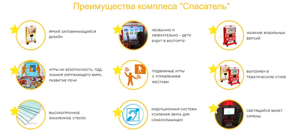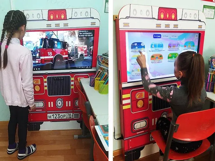 Очень важно, что данный комплекс оснащен не только стандартными играми с сенсорным управлением на экране, но и подвижными играми, управление в которых осуществляется с расстояния: жестами рук, ходьбой и бегом на месте, приседаниями и перемещениями из стороны в сторону. Такие игры вызывают огромный интерес у детей, и развивают не только память, логику и мышление, но и моторику и координацию. На комплексе установлена настоящая сирена, которая включается при запуске, а также может быть использована педагогом в нужный момент для привлечения внимания при рассмотрении различных ситуаций.